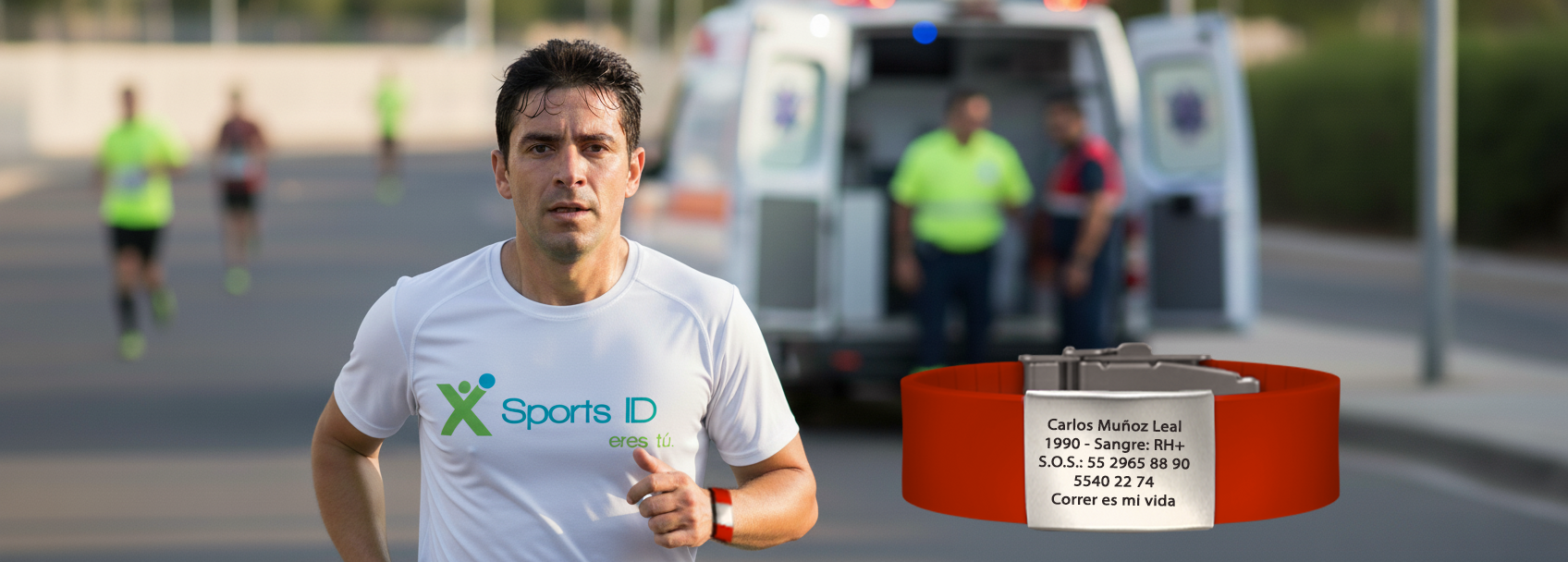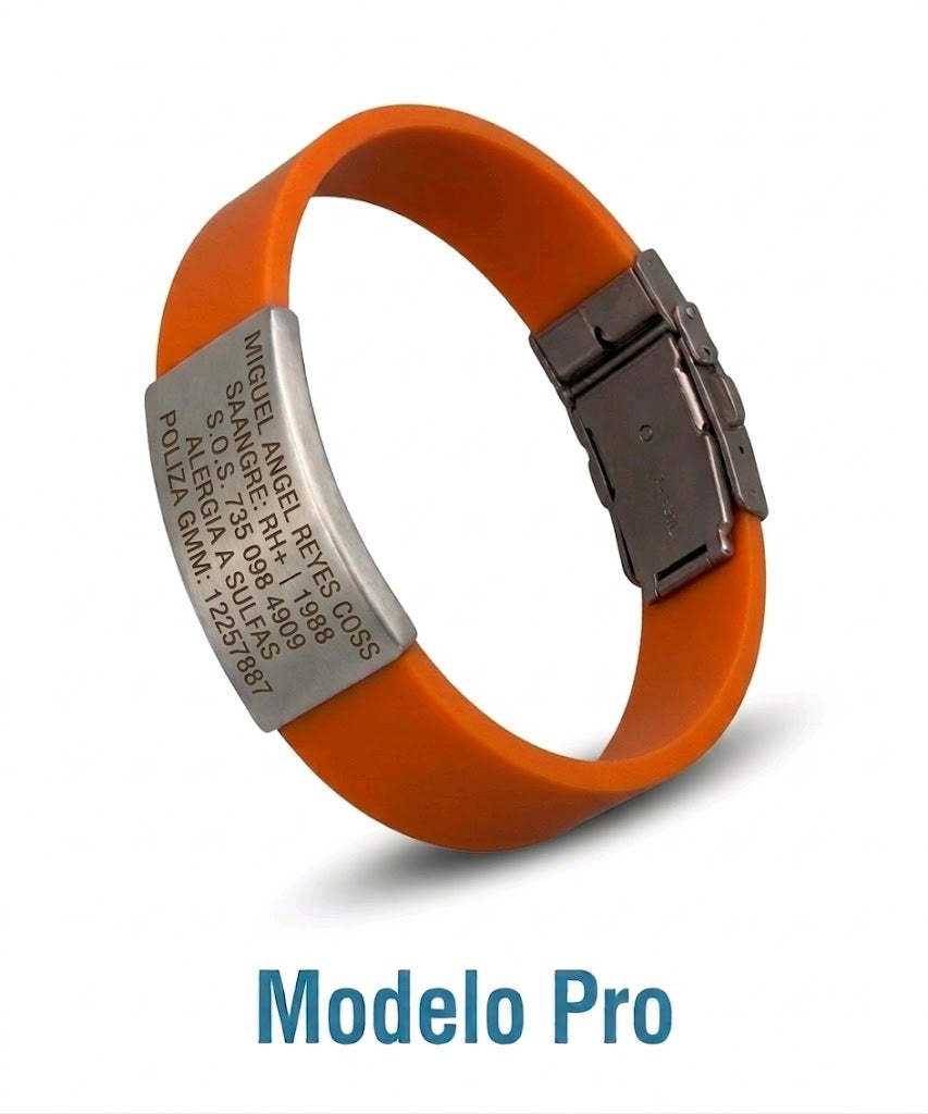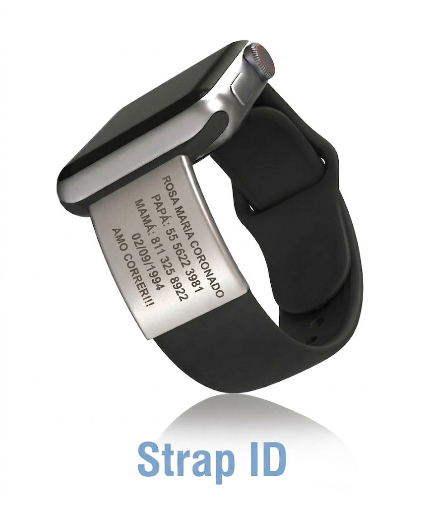 Sports ID graba tu información vital en acero inoxidable. Tu nombre, contactos de emergencia, tipo de sangre, alergias, etc.. Siempre listos cuando más importan.